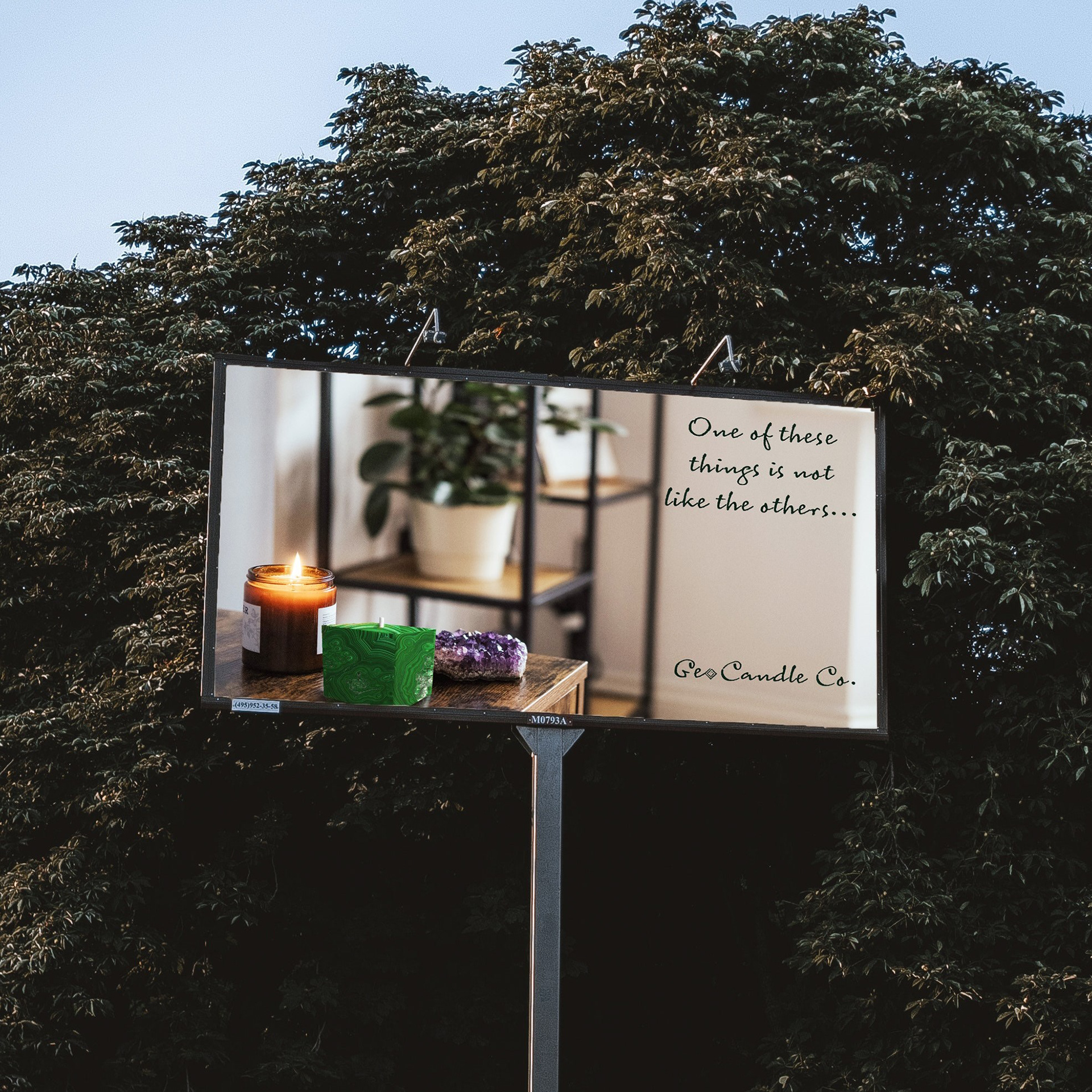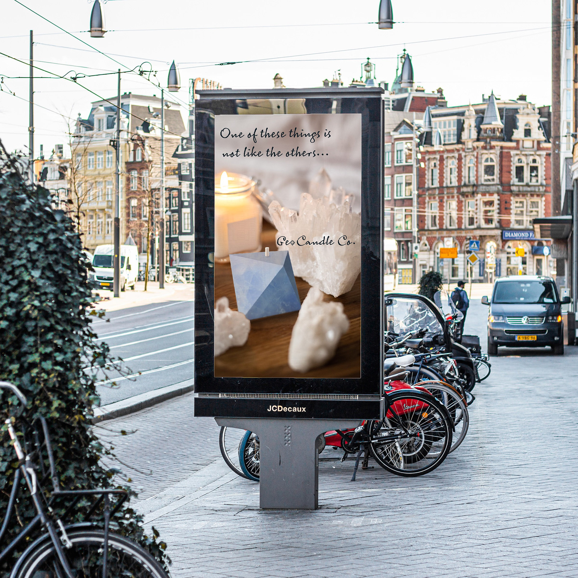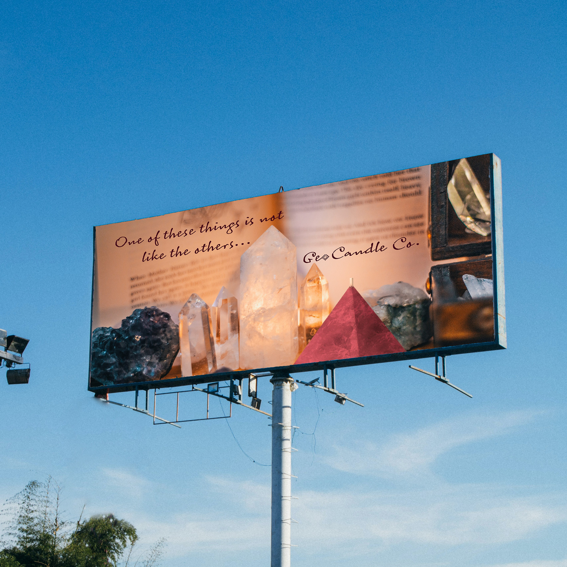 Geo Candle Co. is a mock company that makes candles that resemble polished gemstones. I made ads, packaging, and website mockups to demonstrate what the company's branding would be like if it were real.