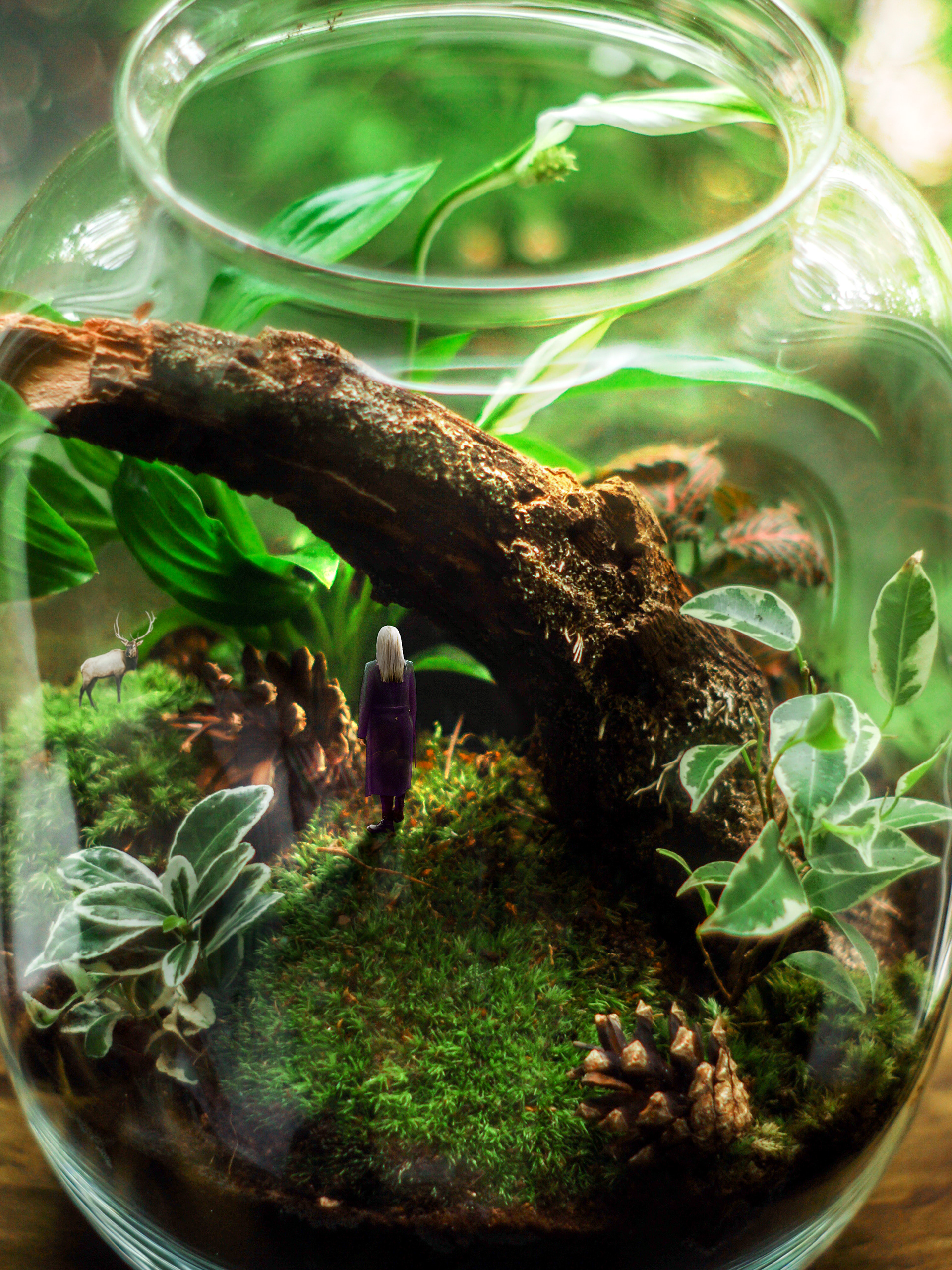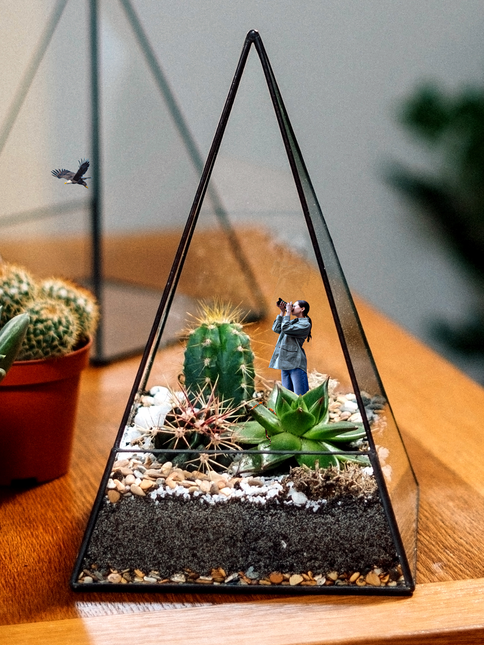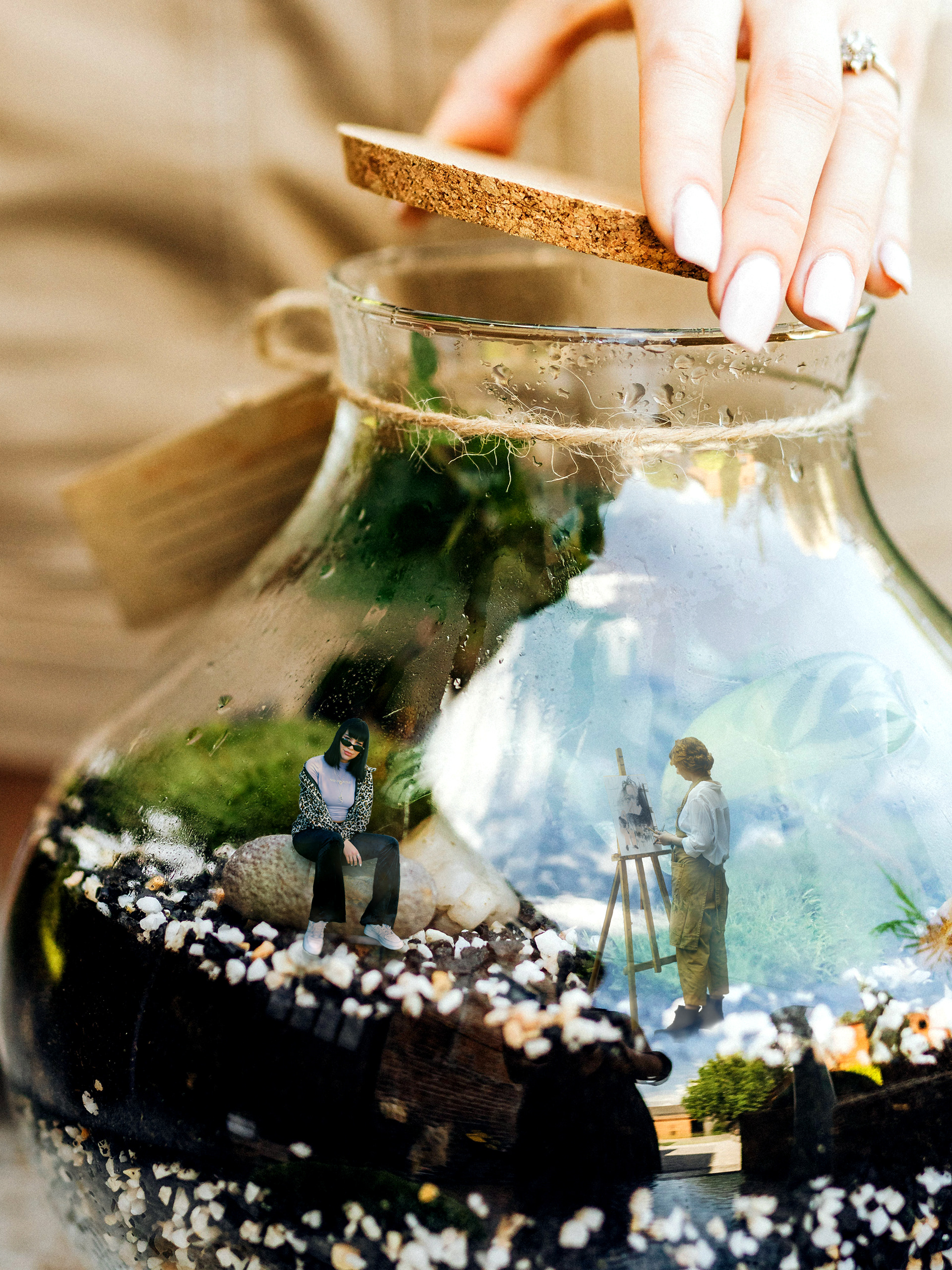 I've always been interested in terrariums. They're like tiny, self-contained worlds. I thought it would be cool to put actual people and animals inside terrariums. This project really helped me get comfortable with Photoshop's functions.